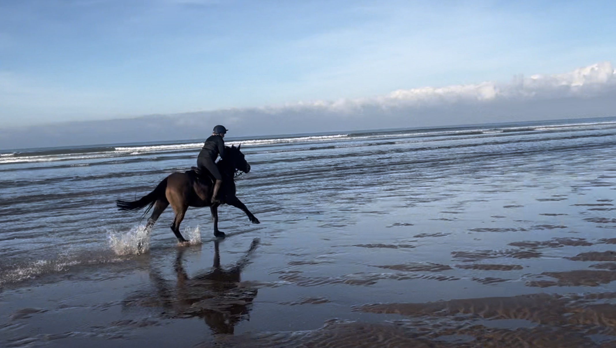 Raven has been on beach and moorland rides & enjoys being out and about. He is hacking alone & in company, regularly ridden in heavy traffic and open spaces. Raven travels in the lorry & trailer alone or in company, he has always been the same horse at home or away.